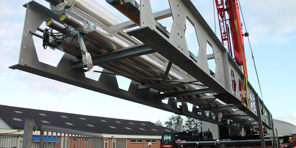 In samenwerking met Oving Constructie heeft Lasmotec voor een opdrachtgever in het Noorden van het land een leidingbrug gerealiseerd. Deze leidingbrug is op het terrein van Lasmotec in vier gedeeltes opgebouwd en vorige week op transport gegaan naar de locatie.