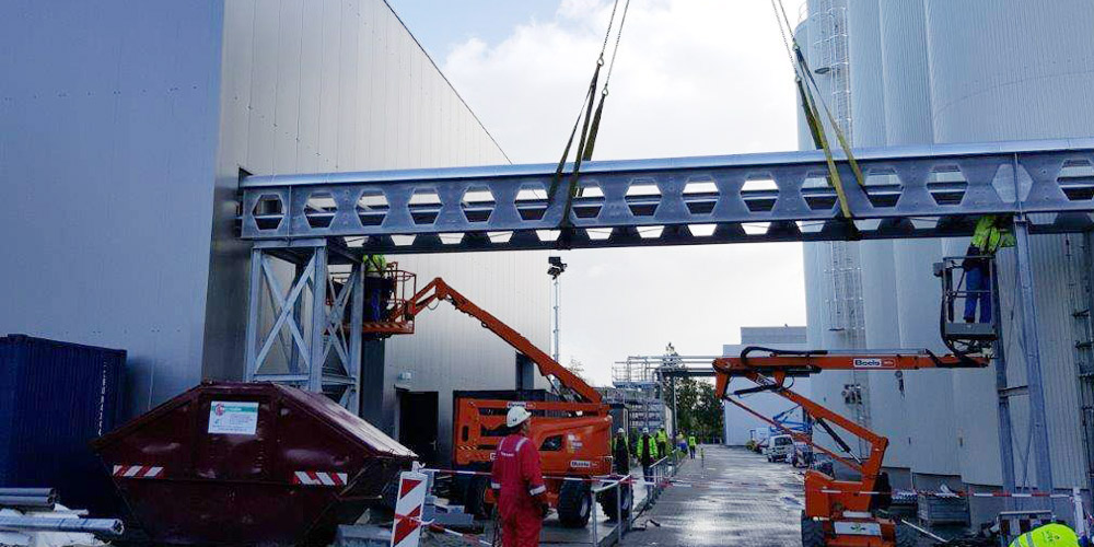 In deze leidingbrug van 66 meter totaal liggen onder andere diverse utility leidingen zoals stoom, condensaat, perslucht en gasleidingen. Deze leidingen zijn onder keur door Lasmotec gefabriceerd.
