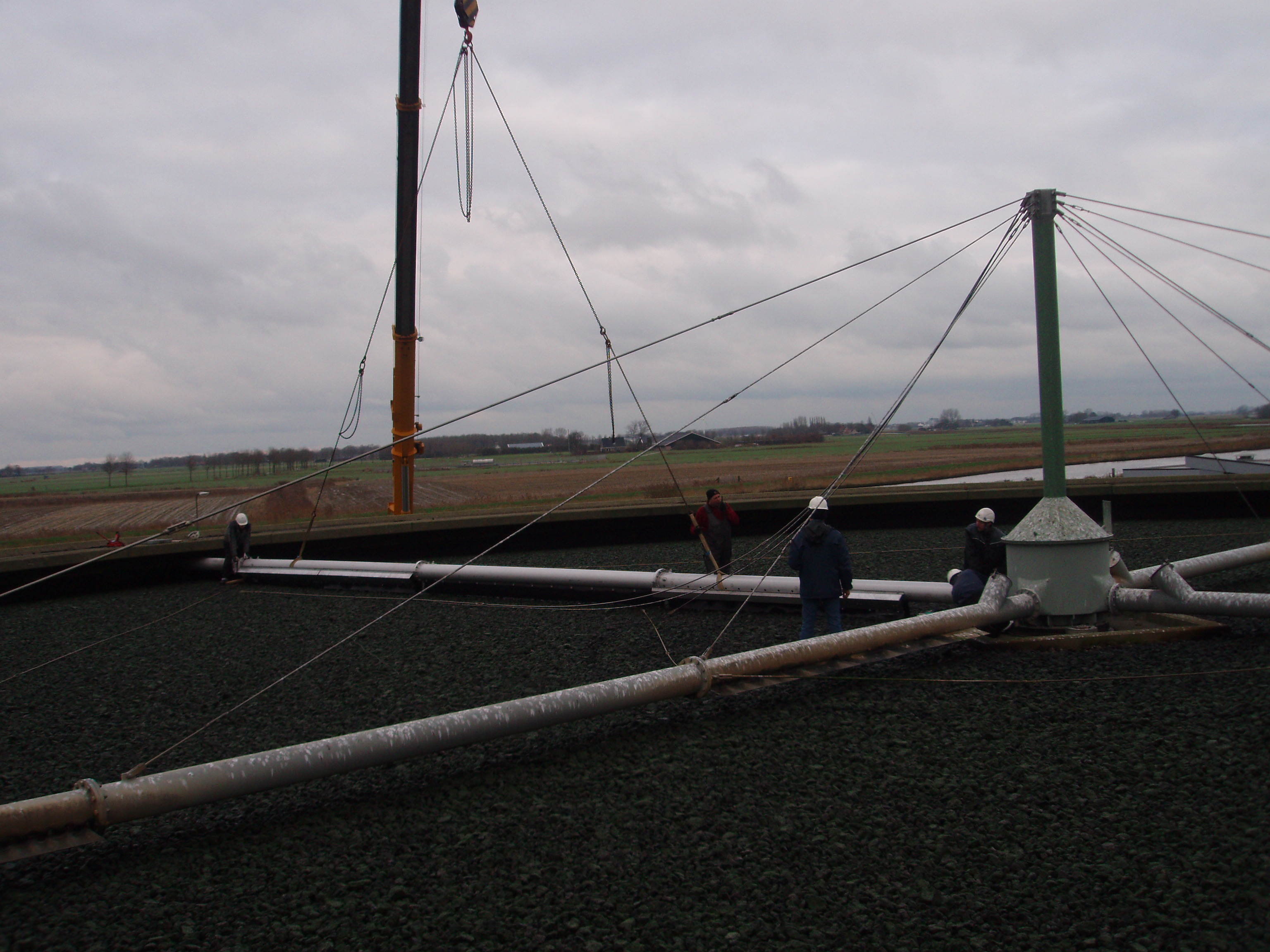 Voor een zuiveringsbedrijf zijn gigantische sproeiarmen gemaakt. Eerst zijn deze pre-gefabriceerd in de werkplaats van Lasmotec waarna deze op transport zijn gegaan naar locatie. Daar zijn de montage werkzaamheden van de hele installatie uitgevoerd.